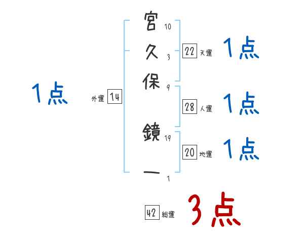 人運![]() | 宮久保鏡一さんの人運は28画の1つ星!家庭環境に注意。スポーツで活躍できる能力があるかも。 性格や才能などを表す2番目に重要な運勢です。人間関係や協調性、社会的な成功に影響します。主に20歳から50歳ぐらいまでの中年期の運勢を表します。 |