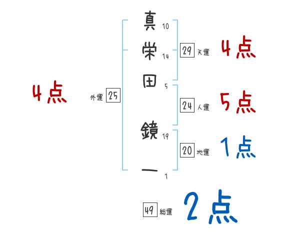人運![]() | 真栄田鏡一さんの人運は24画の5つ星!家庭運が良く順調な人生。金運にも恵まれる。 性格や才能などを表す2番目に重要な運勢です。人間関係や協調性、社会的な成功に影響します。主に20歳から50歳ぐらいまでの中年期の運勢を表します。 |