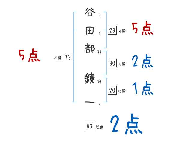 総運![]() | 谷田部鏡一さんの総運は43画の2つ星!頑固な性格で独立心が強いかも。やや非現実的で浪費に注意しましょう。 あなたの人生を表す1番重要な運勢です。生涯を通じて影響する総合運となり、主に50歳以降の晩年期に影響を及ぼします。 |