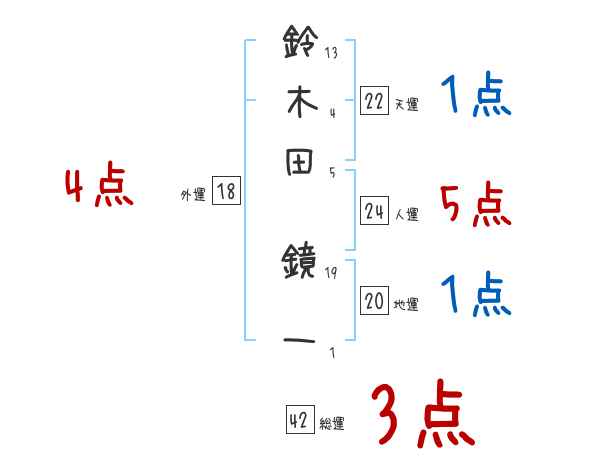 人運![]() | 鈴木田鏡一さんの人運は24画の5つ星!家庭運が良く順調な人生。金運にも恵まれる。 性格や才能などを表す2番目に重要な運勢です。人間関係や協調性、社会的な成功に影響します。主に20歳から50歳ぐらいまでの中年期の運勢を表します。 |