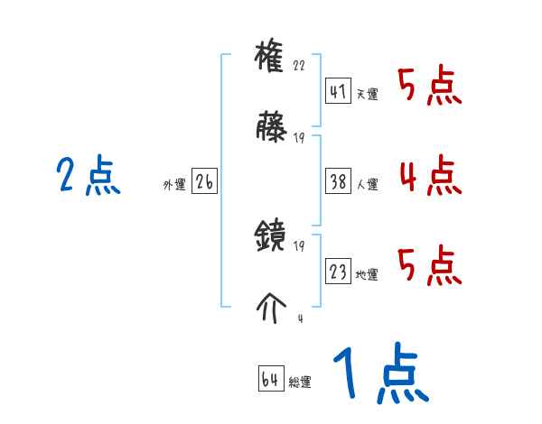 天運![]() | 権藤鏡介さんの天運は41画の5つ星!大志を抱き、目標に向かって実力を発揮し達成する。温和な性格。 家系が持つ宿命的な運勢を表します。祖先から受け継いだ苗字ですので自分の力が及びません。家柄を象徴します。 |