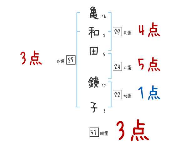 天運![]() | 亀和田鏡子さんの天運は29画の4つ星!完全主義で才能がある。厳格な心の持ち主。 家系が持つ宿命的な運勢を表します。祖先から受け継いだ苗字ですので自分の力が及びません。家柄を象徴します。 |