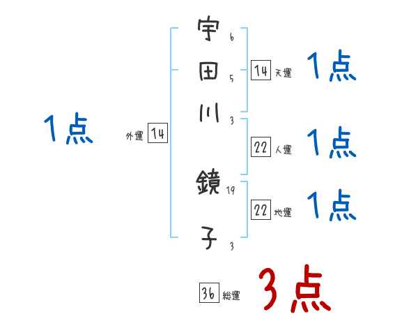 総運![]() | 宇田川鏡子さんの総運は36画の3つ星!先見性が豊かです。多少神経質で苦労することも。 あなたの人生を表す1番重要な運勢です。生涯を通じて影響する総合運となり、主に50歳以降の晩年期に影響を及ぼします。 |