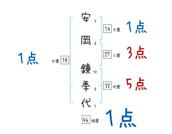 地運![]() | 安岡鏡季代さんの地運は32画の5つ星!柔軟性があり成功する。チャンスが多く金運が良い。 個性を表す基礎的な運勢です。性格形成や対人関係、行動力など家庭環境に影響されます。主に誕生してから20歳くらいまでの若年期の運勢を表します。 |