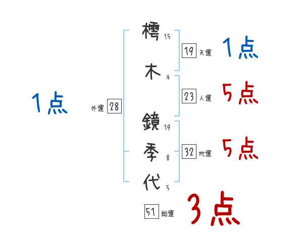 人運![]() | 樗木鏡季代さんの人運は23画の5つ星!想像力に優れ活力がある。一代で成功し名誉を手に入れる。 性格や才能などを表す2番目に重要な運勢です。人間関係や協調性、社会的な成功に影響します。主に20歳から50歳ぐらいまでの中年期の運勢を表します。 |
