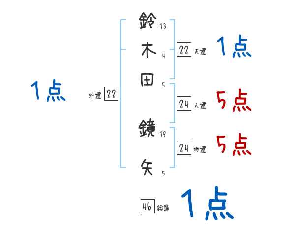 外運![]() | 鈴木田鏡矢さんの外運は22画の1つ星!努力することが苦手ないっぽう手先が器用。芸術性にも優れる。 生活面を象徴する運勢です。外部から受ける影響力を表し、結婚運、家庭運や職場、環境への順応性を表します。 |