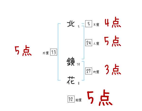 天運![]() | 北鏡花さんの天運は5画の4つ星!健康で安泰。協調性に優れ、財産に恵まれる。 家系が持つ宿命的な運勢を表します。祖先から受け継いだ苗字ですので自分の力が及びません。家柄を象徴します。 |