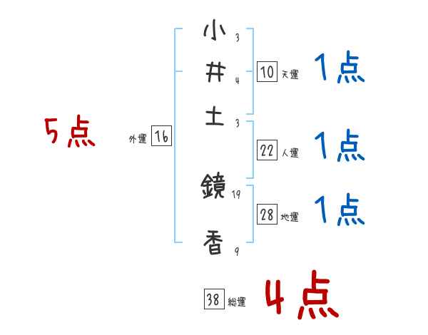 外運![]() | 小井土鏡香さんの外運は16画の5つ星!人望が厚く大きく発展する。逆転成功が見える。 生活面を象徴する運勢です。外部から受ける影響力を表し、結婚運、家庭運や職場、環境への順応性を表します。 |