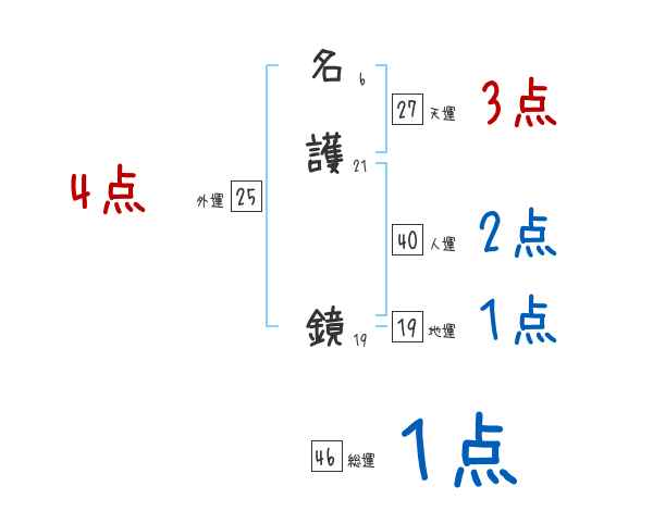 人運![]() | 名護鏡さんの人運は40画の2つ星!自信過剰で物事に固執するためトラブルに注意。 性格や才能などを表す2番目に重要な運勢です。人間関係や協調性、社会的な成功に影響します。主に20歳から50歳ぐらいまでの中年期の運勢を表します。 |