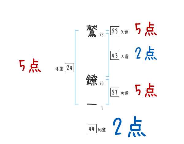 天運![]() | 鷲鐐一さんの天運は23画の5つ星!想像力に優れ活力がある。一代で成功し名誉を手に入れる。 家系が持つ宿命的な運勢を表します。祖先から受け継いだ苗字ですので自分の力が及びません。家柄を象徴します。 |