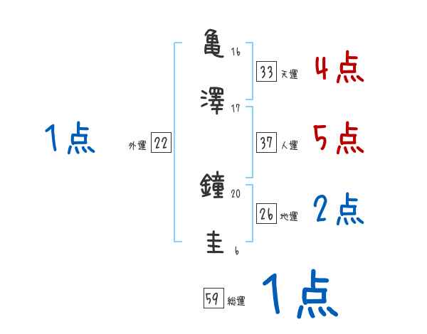 天運![]() | 亀澤鐘圭さんの天運は33画の4つ星!権力志向でプライドが高い。勇気があり運を切り開き成功する。 家系が持つ宿命的な運勢を表します。祖先から受け継いだ苗字ですので自分の力が及びません。家柄を象徴します。 |