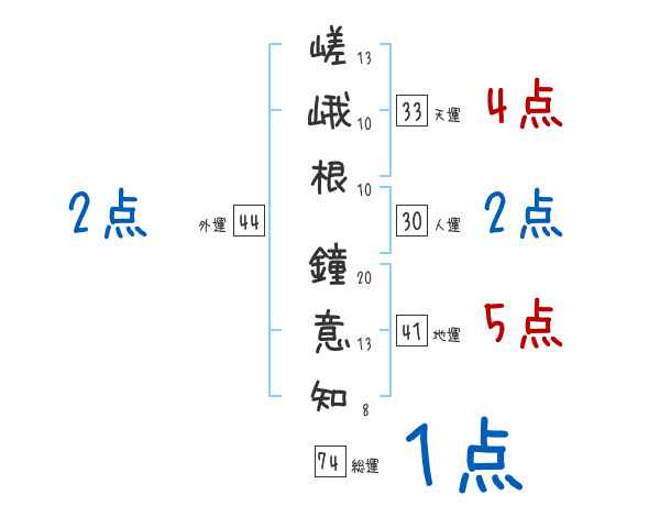 外運![]() | 嵯峨根鐘意知さんの外運は44画の2つ星!誠実で慎重な性格。物事を考えすぎないように注意しましょう。 生活面を象徴する運勢です。外部から受ける影響力を表し、結婚運、家庭運や職場、環境への順応性を表します。 |