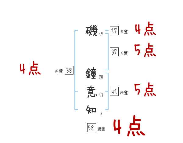 外運![]() | 磯鐘意知さんの外運は38画の4つ星!温厚な性格で技術的な才能を発揮する。職人的な仕事に向いている。 生活面を象徴する運勢です。外部から受ける影響力を表し、結婚運、家庭運や職場、環境への順応性を表します。 |