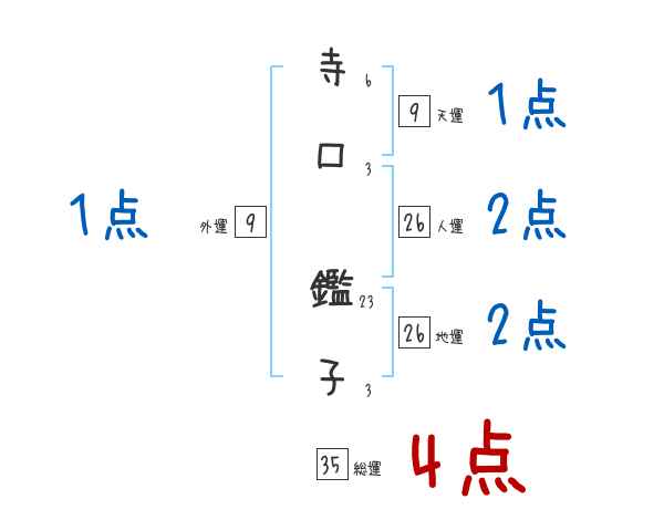天運![]() | 寺口鑑子さんの天運は9画の1つ星!消極的で才能を発揮することが苦手なことも。周りの意見に耳を傾けましょう。 家系が持つ宿命的な運勢を表します。祖先から受け継いだ苗字ですので自分の力が及びません。家柄を象徴します。 |