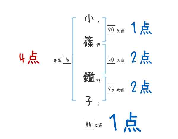 外運![]() | 小篠鑑子さんの外運は6画の4つ星!慎重な努力家で信頼を得る。誠実な精神で向上心に優れる。 生活面を象徴する運勢です。外部から受ける影響力を表し、結婚運、家庭運や職場、環境への順応性を表します。 |