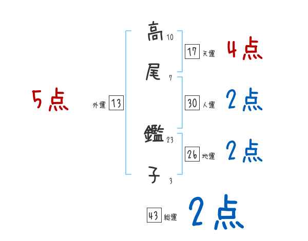 総運![]() | 高尾鑑子さんの総運は43画の2つ星!頑固な性格で独立心が強いかも。やや非現実的で浪費に注意しましょう。 あなたの人生を表す1番重要な運勢です。生涯を通じて影響する総合運となり、主に50歳以降の晩年期に影響を及ぼします。 |