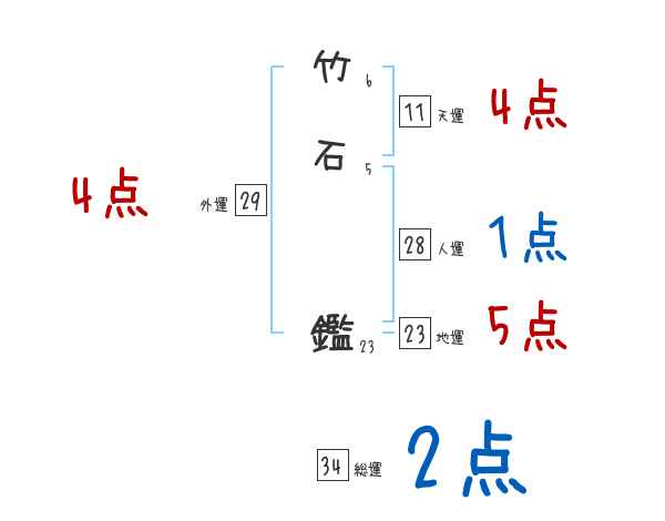 天運![]() | 竹石鑑さんの天運は11画の4つ星!着実に富や地位を得る幸運な人生。 家系が持つ宿命的な運勢を表します。祖先から受け継いだ苗字ですので自分の力が及びません。家柄を象徴します。 |