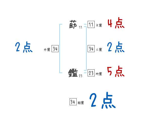 総運![]() | 莇鑑さんの総運は34画の2つ星!独創性に優れるが、自尊心が強く災難に注意しましょう。 あなたの人生を表す1番重要な運勢です。生涯を通じて影響する総合運となり、主に50歳以降の晩年期に影響を及ぼします。 |