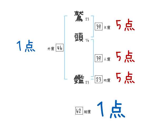 天運![]() | 鷲頭鑑さんの天運は39画の5つ星!社交性に優れ人望が厚い。人の上に立ち成功する。 家系が持つ宿命的な運勢を表します。祖先から受け継いだ苗字ですので自分の力が及びません。家柄を象徴します。 |
