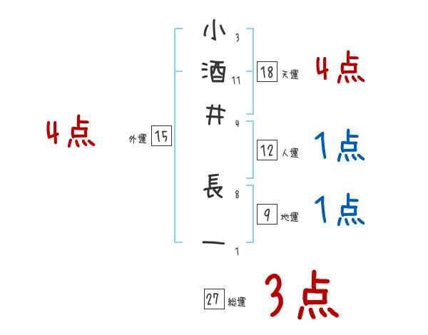天運![]() | 小酒井長一さんの天運は18画の4つ星!情熱的で剛気。忍耐力があり信頼される。 家系が持つ宿命的な運勢を表します。祖先から受け継いだ苗字ですので自分の力が及びません。家柄を象徴します。 |