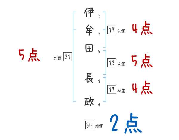 総運![]() | 伊牟田長政さんの総運は34画の2つ星!独創性に優れるが、自尊心が強く災難に注意しましょう。 あなたの人生を表す1番重要な運勢です。生涯を通じて影響する総合運となり、主に50歳以降の晩年期に影響を及ぼします。 |