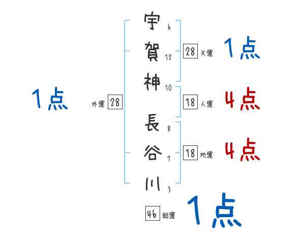 | 総運  | 宇賀神長谷川さんの総運は46画の1つ星!迷走することが多く苦労するかも。目先のことにとらわれないように。あなたの人生を表す1番重要な運勢です。生涯を通じて影響する総合運となり、主に50歳以降の晩年期に影響を及ぼします。 |