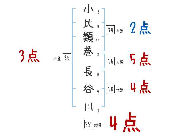外運![]() | 小比類巻長谷川さんの外運は36画の3つ星!先見性が豊かです。多少神経質で苦労することも。 生活面を象徴する運勢です。外部から受ける影響力を表し、結婚運、家庭運や職場、環境への順応性を表します。 |
