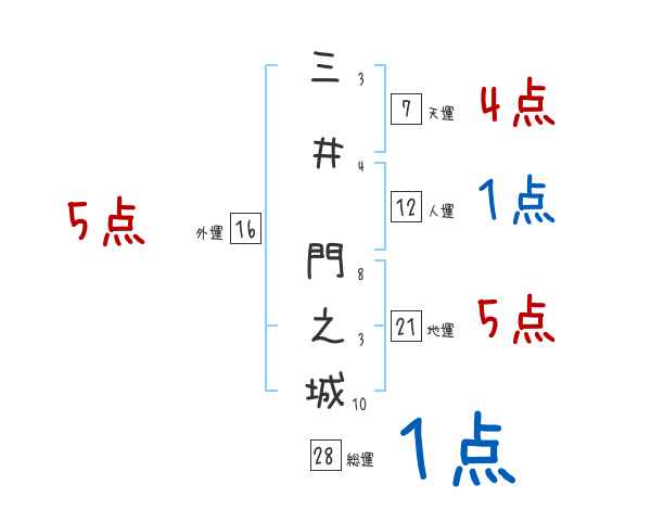 総運![]() | 三井門之城さんの総運は28画の1つ星!家庭環境に注意。スポーツで活躍できる能力があるかも。 あなたの人生を表す1番重要な運勢です。生涯を通じて影響する総合運となり、主に50歳以降の晩年期に影響を及ぼします。 |