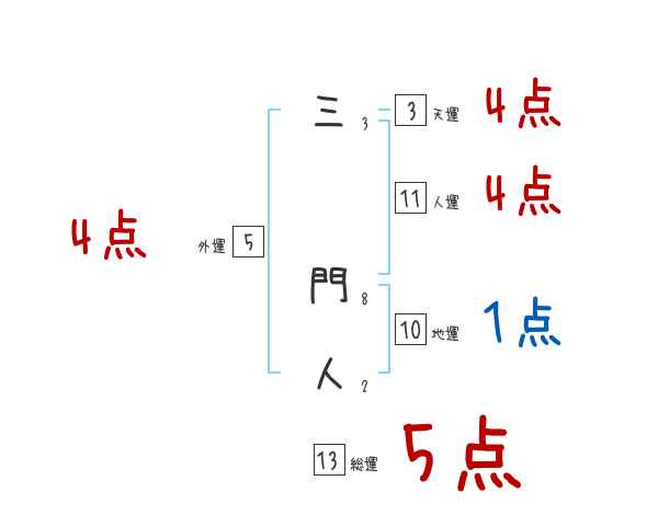 天運![]() | 三門人さんの天運は3画の4つ星!活動的で才能に恵まれ、多くの信頼を得る。希望に満ち成長する。 家系が持つ宿命的な運勢を表します。祖先から受け継いだ苗字ですので自分の力が及びません。家柄を象徴します。 |