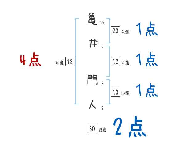 総運![]() | 亀井門人さんの総運は30画の2つ星!浮き沈みの激しさに注意しましょう。 あなたの人生を表す1番重要な運勢です。生涯を通じて影響する総合運となり、主に50歳以降の晩年期に影響を及ぼします。 |