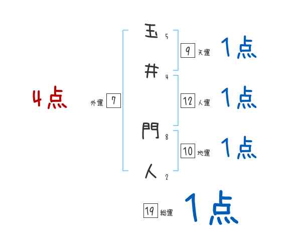 天運![]() | 玉井門人さんの天運は9画の1つ星!消極的で才能を発揮することが苦手なことも。周りの意見に耳を傾けましょう。 家系が持つ宿命的な運勢を表します。祖先から受け継いだ苗字ですので自分の力が及びません。家柄を象徴します。 |