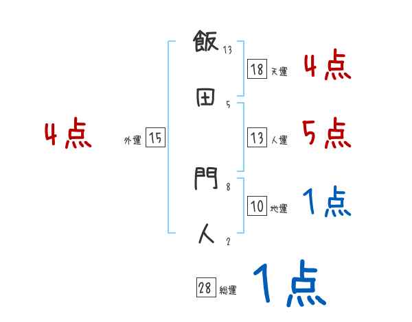 総運![]() | 飯田門人さんの総運は28画の1つ星!家庭環境に注意。スポーツで活躍できる能力があるかも。 あなたの人生を表す1番重要な運勢です。生涯を通じて影響する総合運となり、主に50歳以降の晩年期に影響を及ぼします。 |