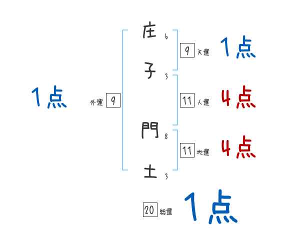 天運![]() | 庄子門土さんの天運は9画の1つ星!消極的で才能を発揮することが苦手なことも。周りの意見に耳を傾けましょう。 家系が持つ宿命的な運勢を表します。祖先から受け継いだ苗字ですので自分の力が及びません。家柄を象徴します。 |