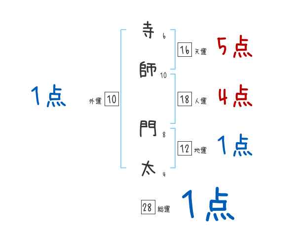 天運![]() | 寺師門太さんの天運は16画の5つ星!人望が厚く大きく発展する。逆転成功が見える。 家系が持つ宿命的な運勢を表します。祖先から受け継いだ苗字ですので自分の力が及びません。家柄を象徴します。 |