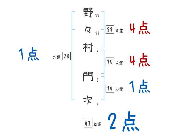 天運![]() | 野々村門次さんの天運は29画の4つ星!完全主義で才能がある。厳格な心の持ち主。 家系が持つ宿命的な運勢を表します。祖先から受け継いだ苗字ですので自分の力が及びません。家柄を象徴します。 |