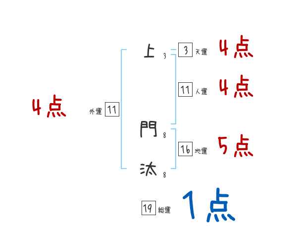 天運![]() | 上門汰さんの天運は3画の4つ星!活動的で才能に恵まれ、多くの信頼を得る。希望に満ち成長する。 家系が持つ宿命的な運勢を表します。祖先から受け継いだ苗字ですので自分の力が及びません。家柄を象徴します。 |
