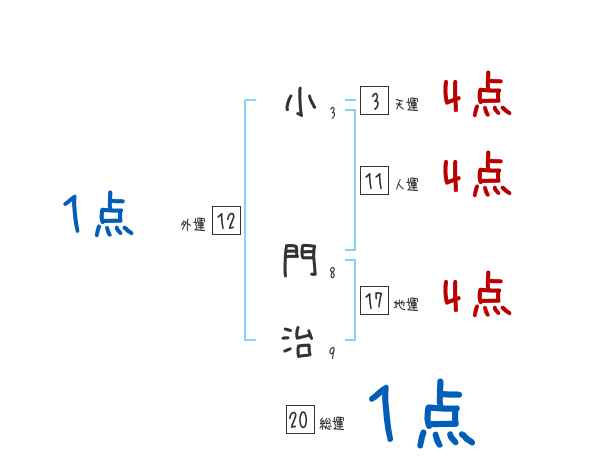 天運![]() | 小門治さんの天運は3画の4つ星!活動的で才能に恵まれ、多くの信頼を得る。希望に満ち成長する。 家系が持つ宿命的な運勢を表します。祖先から受け継いだ苗字ですので自分の力が及びません。家柄を象徴します。 |