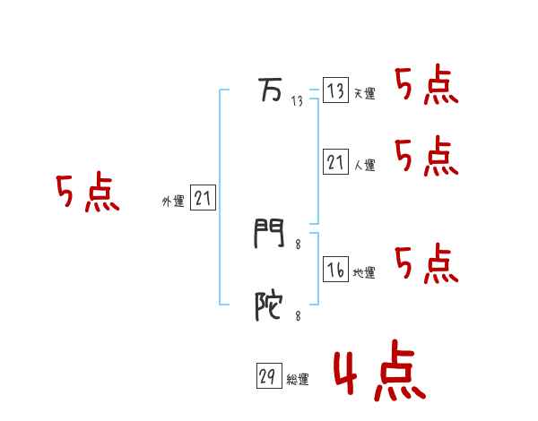 人運![]() | 万門陀さんの人運は21画の5つ星!統率力がある。独立し成功する。名誉を手に入れる。 性格や才能などを表す2番目に重要な運勢です。人間関係や協調性、社会的な成功に影響します。主に20歳から50歳ぐらいまでの中年期の運勢を表します。 |