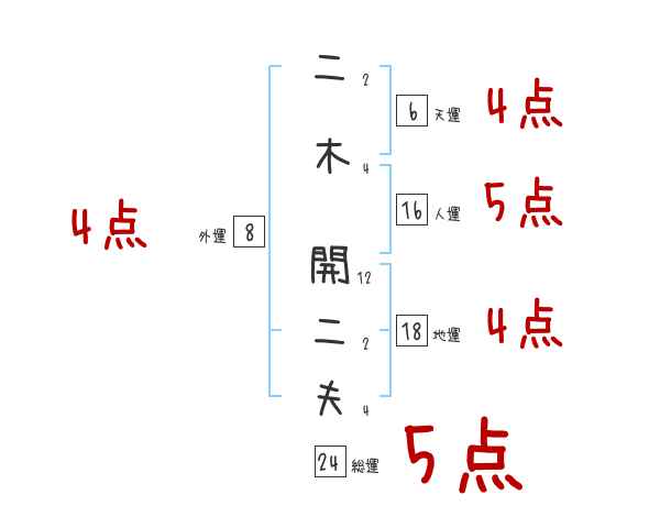 人運![]() | 二木開二夫さんの人運は16画の5つ星!人望が厚く大きく発展する。逆転成功が見える。 性格や才能などを表す2番目に重要な運勢です。人間関係や協調性、社会的な成功に影響します。主に20歳から50歳ぐらいまでの中年期の運勢を表します。 |
