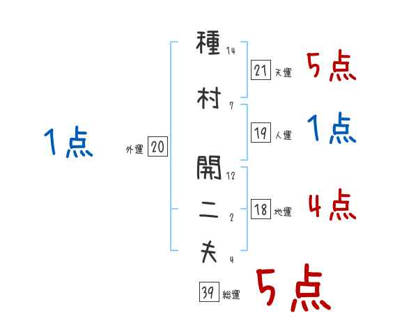 総運![]() | 種村開二夫さんの総運は39画の5つ星!社交性に優れ人望が厚い。人の上に立ち成功する。 あなたの人生を表す1番重要な運勢です。生涯を通じて影響する総合運となり、主に50歳以降の晩年期に影響を及ぼします。 |