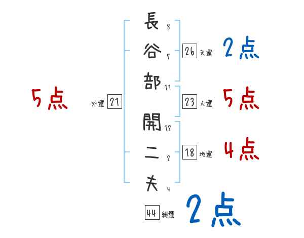 総運![]() | 長谷部開二夫さんの総運は44画の2つ星!誠実で慎重な性格。物事を考えすぎないように注意しましょう。 あなたの人生を表す1番重要な運勢です。生涯を通じて影響する総合運となり、主に50歳以降の晩年期に影響を及ぼします。 |