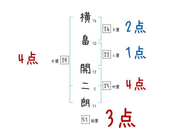 外運![]() | 横畠開二朗さんの外運は29画の4つ星!完全主義で才能がある。厳格な心の持ち主。 生活面を象徴する運勢です。外部から受ける影響力を表し、結婚運、家庭運や職場、環境への順応性を表します。 |