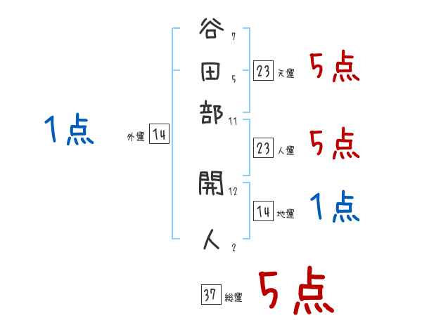 人運![]() | 谷田部開人さんの人運は23画の5つ星!想像力に優れ活力がある。一代で成功し名誉を手に入れる。 性格や才能などを表す2番目に重要な運勢です。人間関係や協調性、社会的な成功に影響します。主に20歳から50歳ぐらいまでの中年期の運勢を表します。 |