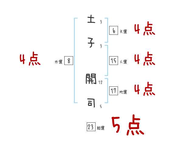 天運![]() | 土子開司さんの天運は6画の4つ星!慎重な努力家で信頼を得る。誠実な精神で向上心に優れる。 家系が持つ宿命的な運勢を表します。祖先から受け継いだ苗字ですので自分の力が及びません。家柄を象徴します。 |