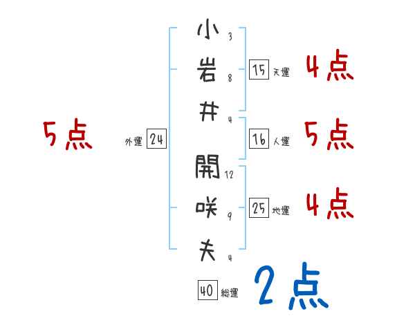 外運![]() | 小岩井開咲夫さんの外運は24画の5つ星!家庭運が良く順調な人生。金運にも恵まれる。 生活面を象徴する運勢です。外部から受ける影響力を表し、結婚運、家庭運や職場、環境への順応性を表します。 |