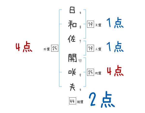 総運![]() | 日和佐開咲夫さんの総運は44画の2つ星!誠実で慎重な性格。物事を考えすぎないように注意しましょう。 あなたの人生を表す1番重要な運勢です。生涯を通じて影響する総合運となり、主に50歳以降の晩年期に影響を及ぼします。 |