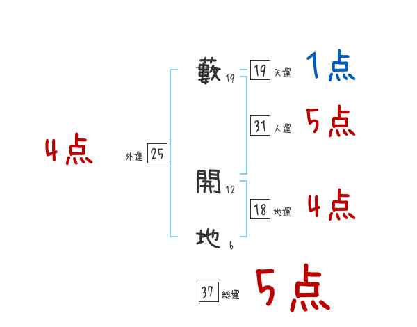 天運![]() | 藪開地さんの天運は19画の1つ星!優れた才能を持ちますが、協調性が足りないことも。周りの人と協力する事を意識しましょう。 家系が持つ宿命的な運勢を表します。祖先から受け継いだ苗字ですので自分の力が及びません。家柄を象徴します。 |