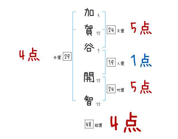天運![]() | 加賀谷開智さんの天運は24画の5つ星!家庭運が良く順調な人生。金運にも恵まれる。 家系が持つ宿命的な運勢を表します。祖先から受け継いだ苗字ですので自分の力が及びません。家柄を象徴します。 |