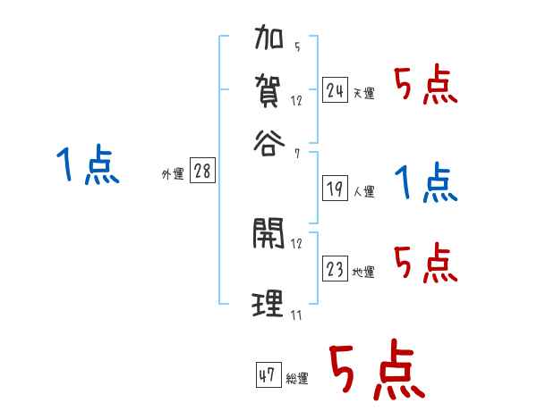 総運![]() | 加賀谷開理さんの総運は47画の5つ星!実力が開花し発展する円満な人生。財に恵まれる。 あなたの人生を表す1番重要な運勢です。生涯を通じて影響する総合運となり、主に50歳以降の晩年期に影響を及ぼします。 |