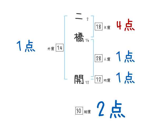 外運![]() | 二橋開さんの外運は14画の1つ星!人に対して優しいがストレスを溜め込みがち。人間関係のトラブルを避けるよう気をつけましょう。 生活面を象徴する運勢です。外部から受ける影響力を表し、結婚運、家庭運や職場、環境への順応性を表します。 |